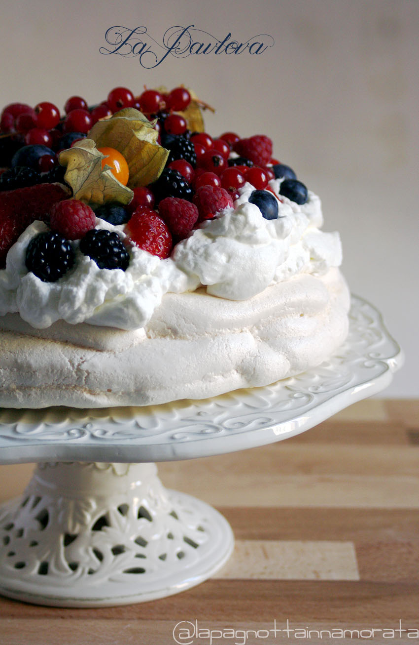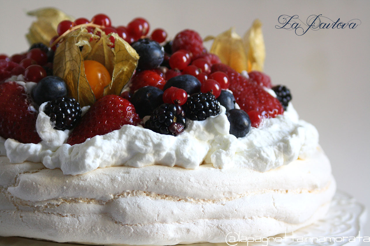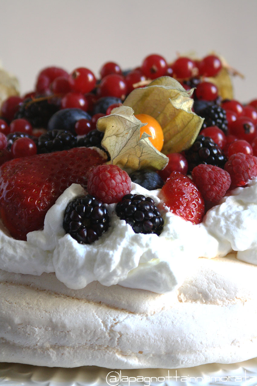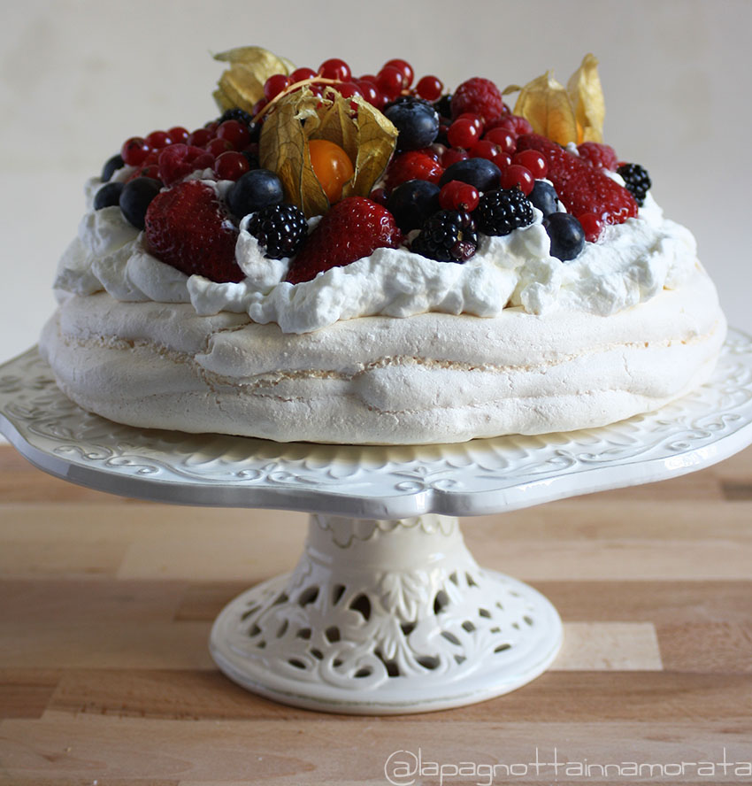 La Pavlova è un dolce che mi ha sempre attirato molto, sarà per quella sua aria sontuosa, sarà per tutta quella meringa e quella panna sovrastate da quella colorata frutta fresca…L’ho sempre trovato un dolce molto raffinato ed elegante, e mi son sempre detta che non sarei mai riuscita a farlo, a causa della meringa. Fino a quando non ho trovato il segreto per la cottura perfetta della meringa, ed allora ho provato a fare la Pavlova e quello che ne è uscito fuori è un dolce veramente buonissimo, scenografico e coloratissimo. Vi basti pensare che quando l’ho portato in tavola, in  miei commensali sono rimasti a guardarla ammutoliti…