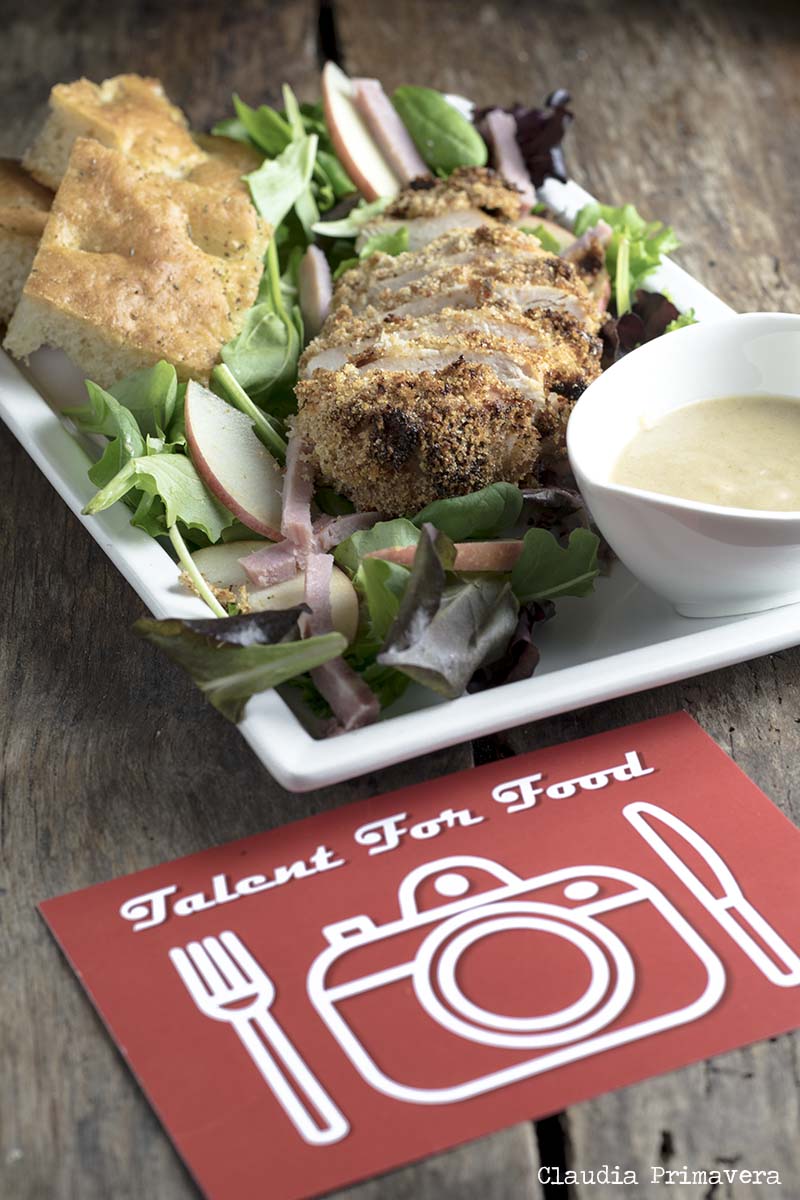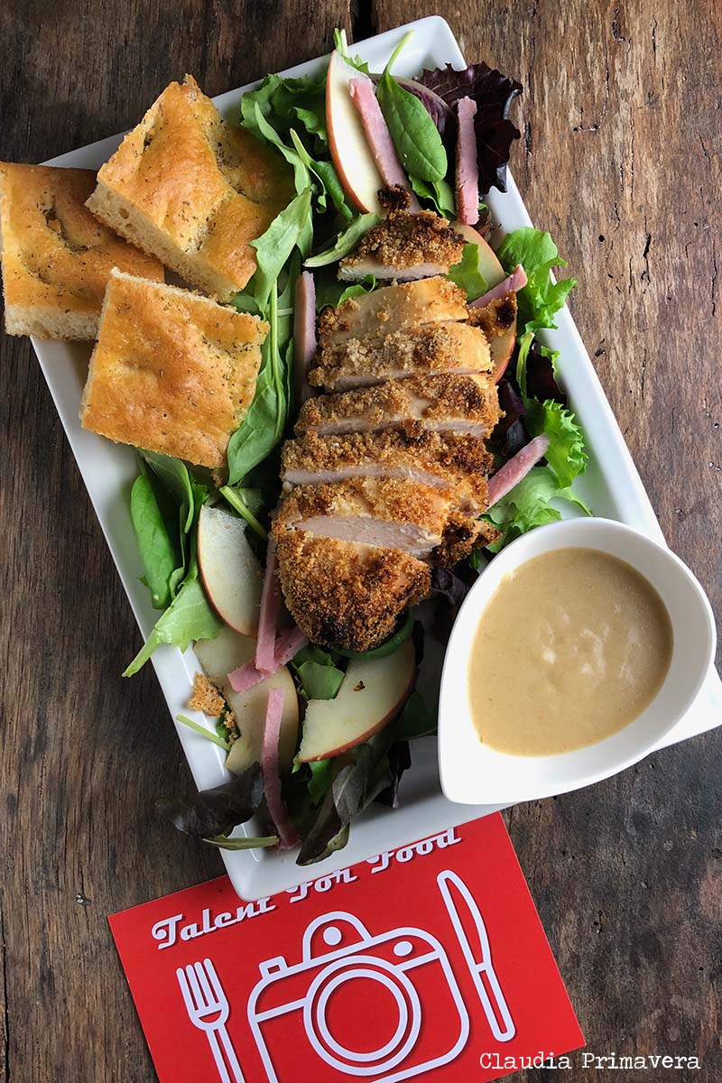 - Disponete sul piatto da portata la salsa in una ciotolina, la focaccia divisa in quadrotti sull’angolo opposto e la misticanza nel centro del piatto, tra la salsa e la focaccia al farro.